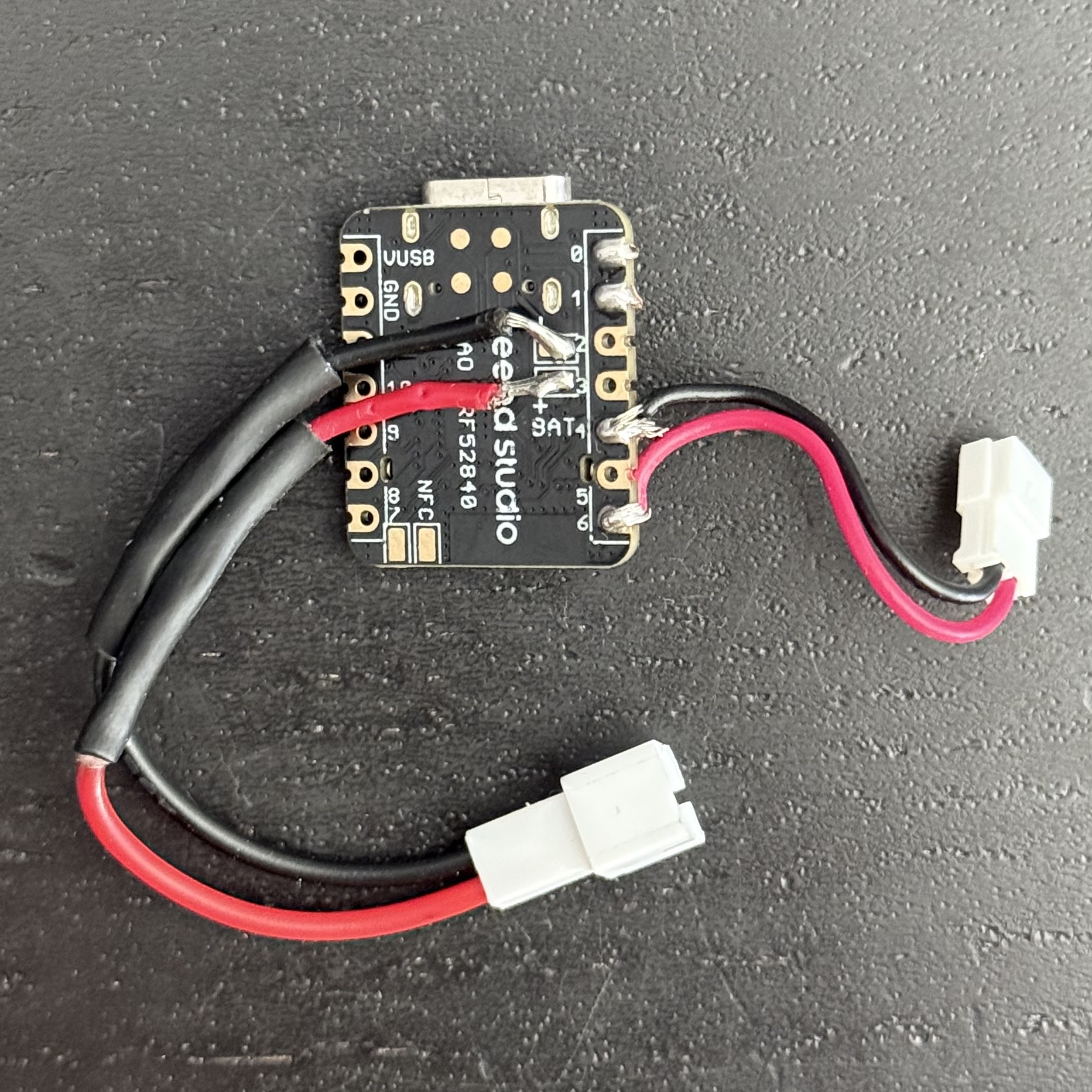 Time to solder everything to the Xiao. I typically start with the battery, and I like to make everything removable which means soldering some JST leads onto the Xiao. Usually LiPO batteries use JST-PH so I used those for the battery connector. When soldering the leads to the Xiao I use the positive pin on the battery section, and the ground on the board itself. You can also solder directly to the board (as below), but it's pretty tight and scary, especially for a soldering noob like me.